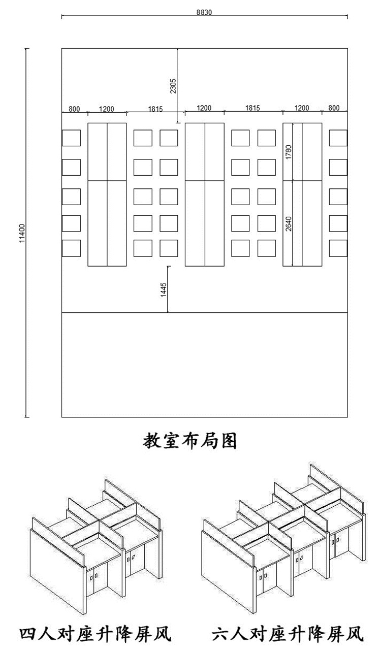 根據廣東交通運輸高級技工學校升降屏風多媒體教室使用需求,本次語音聽說測試考場,結合教室空間布局,設計了四人對位、六人對座位相結合的智能升降屏風桌,最大程度的充分利用教室空間,每個座位都有可升降的屏風,屏風升起后可有效的隔斷相鄰人的正常視線,防噪音效果,可達到互不干擾的作用;不需要屏風時,屏風降下。和普通的教室無異,滿足一教室多用的需求。