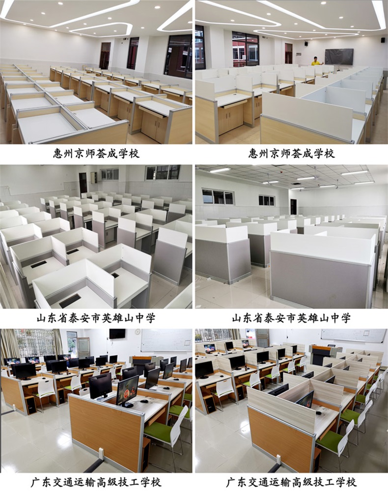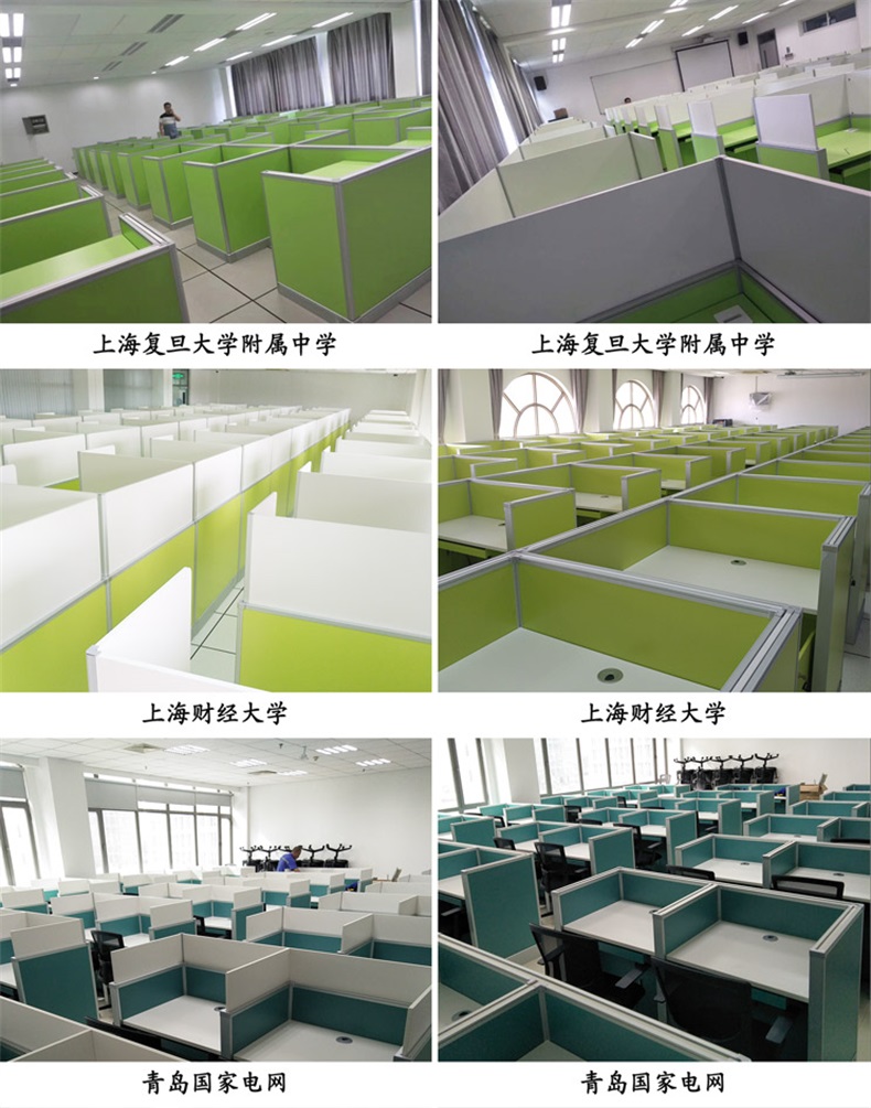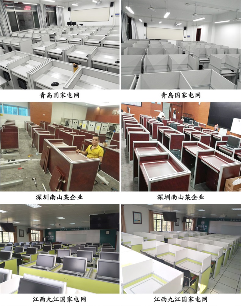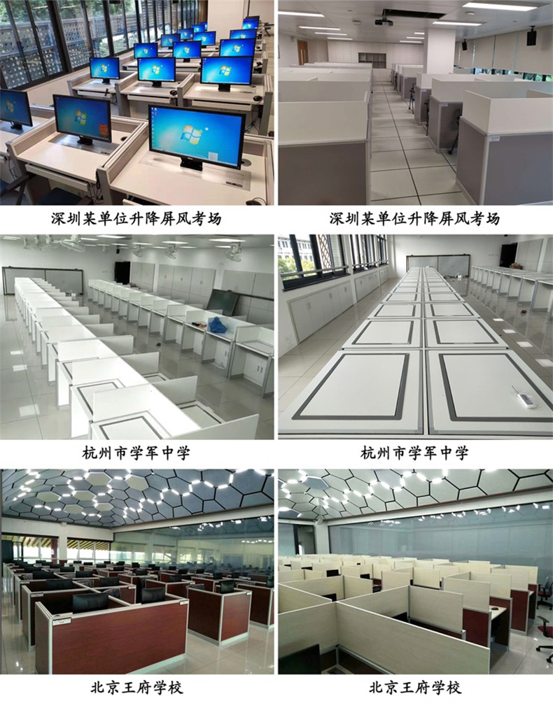 根據(jù)上海科技管理學校對測試實驗實訓室和編碼實訓室使用需求,在產(chǎn)品設計方面,電腦桌的左、右、前三面帶升降屏風擋板,用于隔斷相鄰考生視線。當屏風升起時,可以用作教室計算機標準化考試使用,當屏風降下時,可以用于學生上課使用。實現(xiàn)了一室多用、考學合一。
