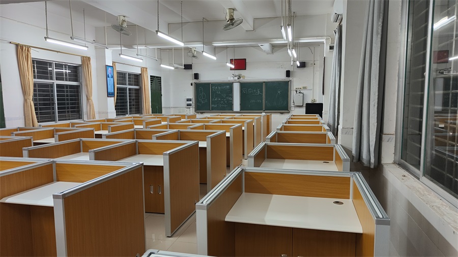 根據廣東梅州興寧實驗學校對升降屏風語音教室的使用需求,方方智能對該教室設計了一套可以升降的智能升降屏風桌,每個座位都有可升降的屏風,考試時屏風升起后可有效的隔斷相鄰人的正常視線,防噪音效果,可達到互不干擾的作用,當屏風降下時,可以用于學生日常上課使用。實現了一室多用、考學合一。
