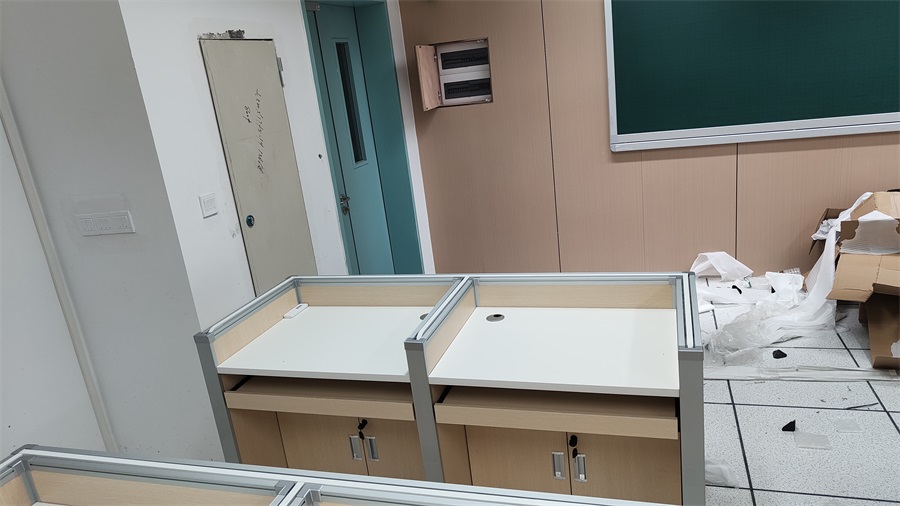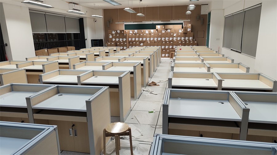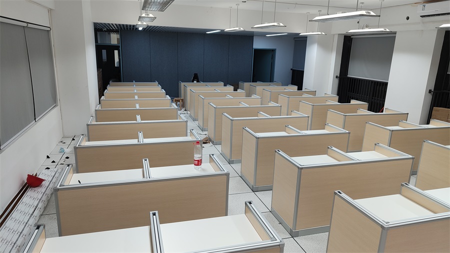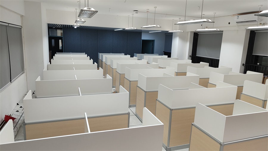 根據深圳市龍華區龍騰學校對升降屏風語音教室的使用需求,方方智能對該教室設計了一套可以升降的智能升降屏風桌,每個座位都有可升降的屏風,考試時屏風升起后可有效的隔斷相鄰人的正常視線,防噪音效果,可達到互不干擾的作用,當屏風降下時,可以用于學生日常上課使用。實現了一室多用、考學合一。