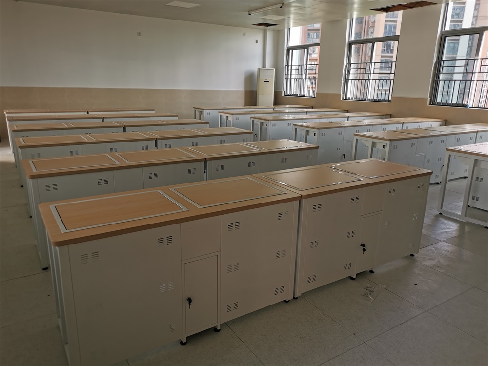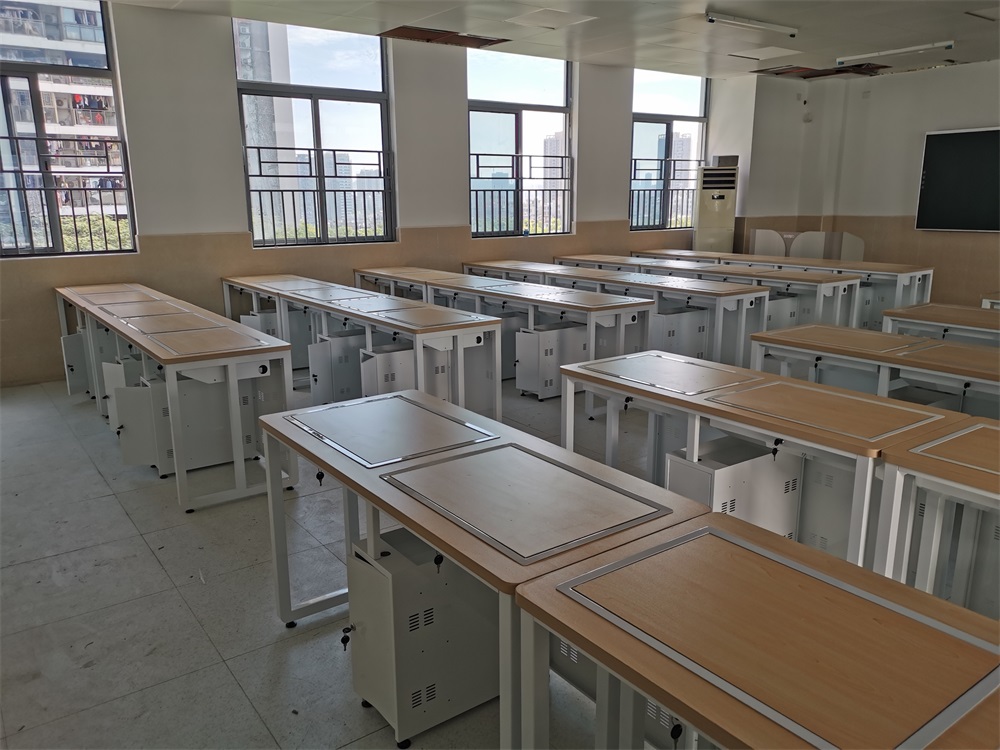 根據(jù)深圳市龍崗區(qū)麓城外國語小學計算機教室使用要求,方方智能為該學校設計了電腦翻轉(zhuǎn)桌。翻轉(zhuǎn)器與電腦桌配套使用,拉動開關(guān)按鈕液晶顯示屏會自動翻起,鍵盤也同時升起與桌面齊平;當不需要使用電腦時,可用手動按下翻蓋面板,整個翻轉(zhuǎn)器與桌面齊平,和普通的教室無異。產(chǎn)品具有防盜、防塵保持桌面平整,美化桌面等功能,電腦桌內(nèi)還可以存放各類文具和學習用品,實現(xiàn)普通教室與計算機教室模式相互切換快速,不阻礙老師與學生之間目光交流,滿足一教室多用的需求。