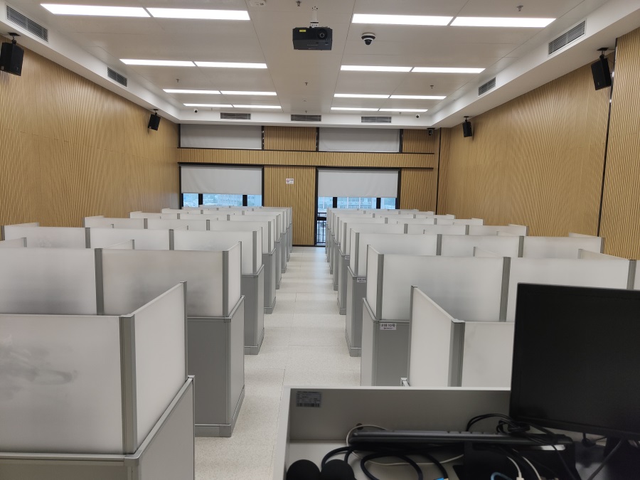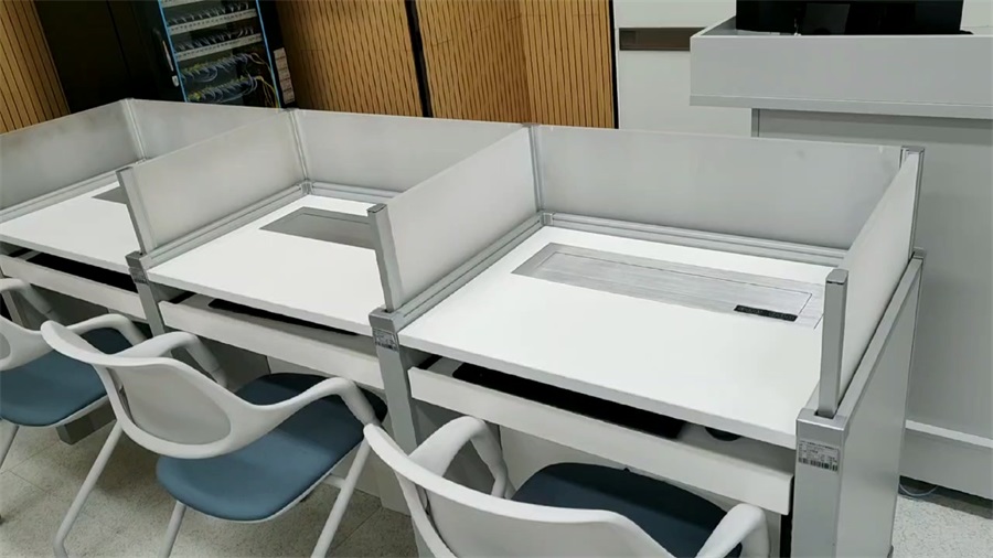 根據深圳市紅十字會人道傳播及教育基地對升降屏風培訓室的使用需求,方方智能對該語音室設計了一套智能升降屏風桌,每個座位都有可升降的屏風,考試時屏風升起后可有效的隔斷相鄰人的正常視線,防噪音效果,可達到互不干擾的作用,平時培訓學習時屏風降下;每個桌子桌面裝有液晶屏升降器,需要使用顯示屏時,隱藏在桌子內部的液晶屏升降器把顯示屏從桌子下面升到桌子上面;當不使用顯示屏時,液晶升降器自動下降,顯示屏隱藏在桌子內部,起到防盜、防塵作用,保持桌子表面的平整和美觀,和普通的教室無異,升降屏風桌實現了空間資源進行最大化的利用,平衡解決了師生之間的溝通與學生考試相互干擾的需要,滿足一教室多用的需求。