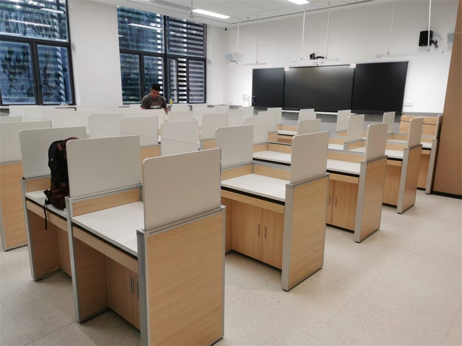 在計算機教室建設方面,根據上海交通大學醫學院的特殊需求,方方智能團隊給該校定制一款升降屏風桌,每個座位都有可升降的屏風,相鄰座位之間帶可升降磨砂玻璃,升降行程為450mm,屏風升起后可有效的隔斷相鄰人的正常視線,防噪音效果,可達到互不干擾的作用,當屏風降下時,可以用于學生日常上課使用。實現了一室多用、考學合一。升降擋板為單面磨砂玻璃,讓整個場景更通透,減少屏風升起時,格子間帶來的密集感。每個座位有可升降的一體機升降器(可遙控一鍵整個教室一體機集中升降),一體機為23.8寸聯想品牌。升降器把一體機下降隱藏在桌子內部時,與普通課桌一樣桌面平齊,可一室多用。