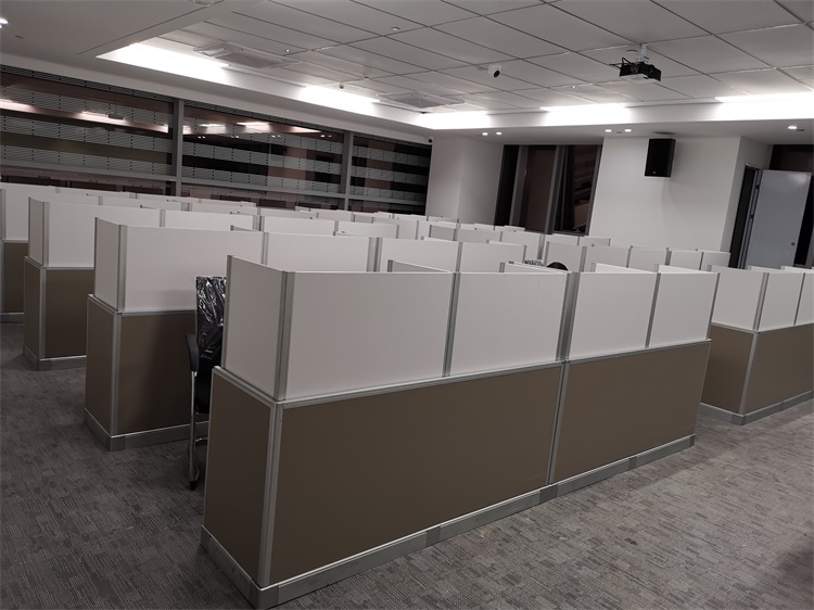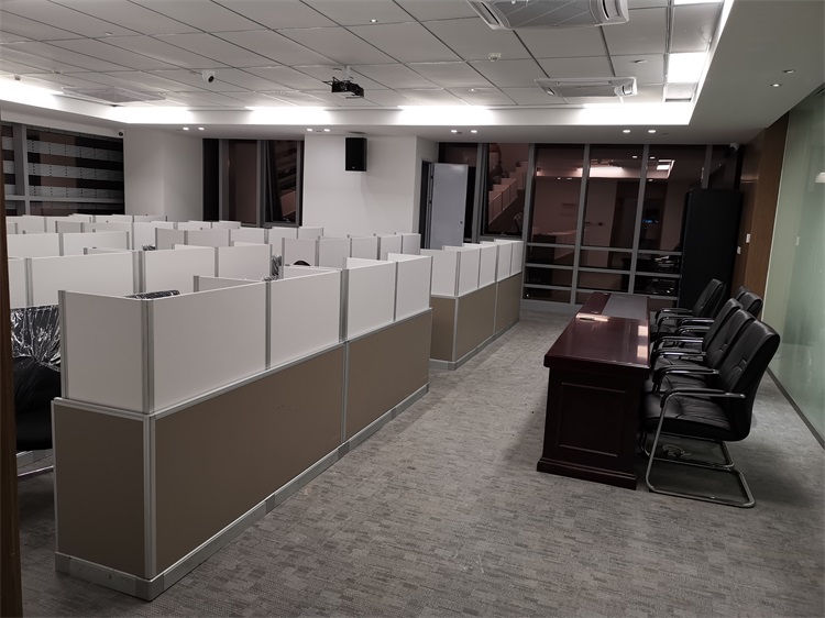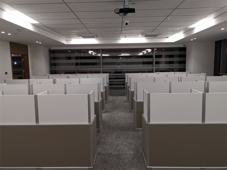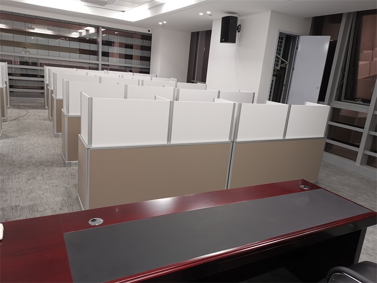 根據珠海市金灣區市民服務中心多媒體教室使用需求,本次語音聽說測試考場,結合教室空間布局,設計了20套雙人位智能升降屏風桌,每個座位都有可升降的屏風,屏風升起后可有效的隔斷相鄰人的正常視線,防噪音效果,可達到互不干擾的作用;不需要屏風時,屏風降下。和普通的教室無異,滿足一教室多用的需求。智能升降屏風教室還有投影大屏顯示系統、拾音系統、視頻跟蹤錄像系統、高保真擴音系統、提升教學質量,滿足公務員對現代智能教室的要求。
