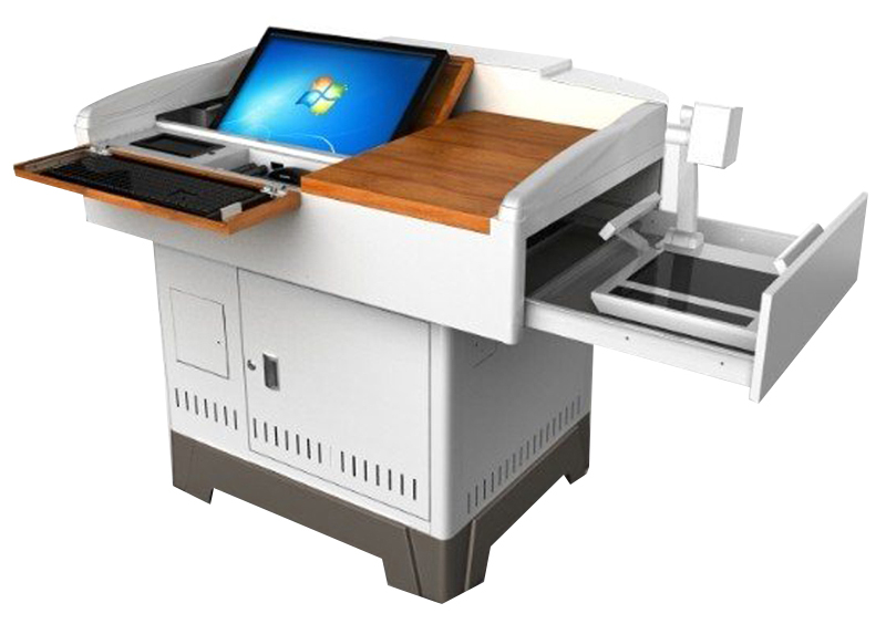 功能:桌面內置19-21寸液晶顯示器翻轉板,仰角任意可調;翻轉式鍵盤盒設計,鍵盤盒下有多功能塑鋼儲物盒可放置中控、便攜展示臺、鼠標、水筆、筆擦;儲物盒內置筆記本電腦接線卡槽;筆記本電腦接線為抽拉方式(USB\VGA\VIDIO\ AUDIO\NET),不用時憑重力自動回收;講桌右側內置抽拉式大展示臺抽屜;鋼塑扶手內可擴充IC讀卡器(選配);桌體采用拆裝設計 |