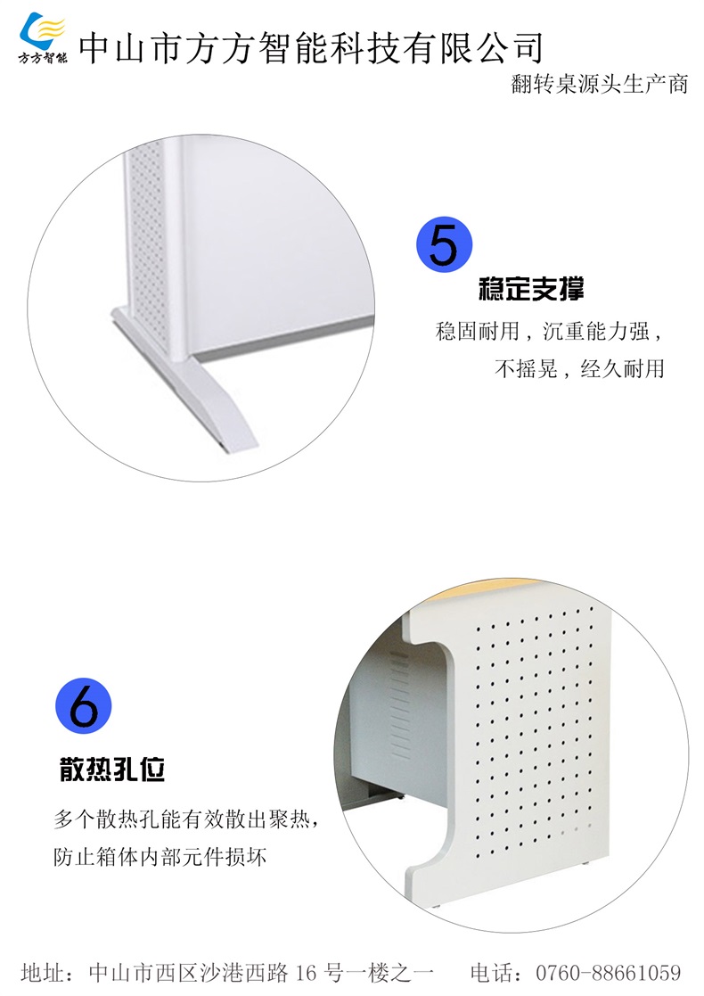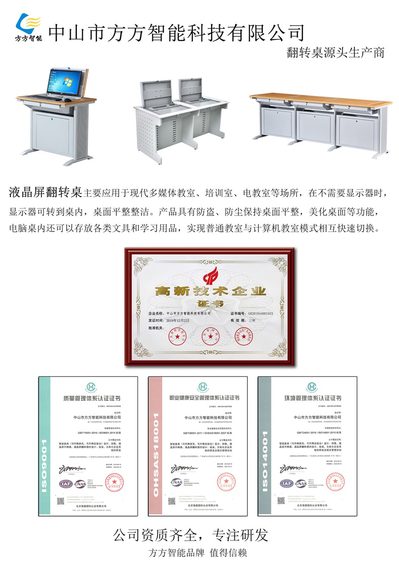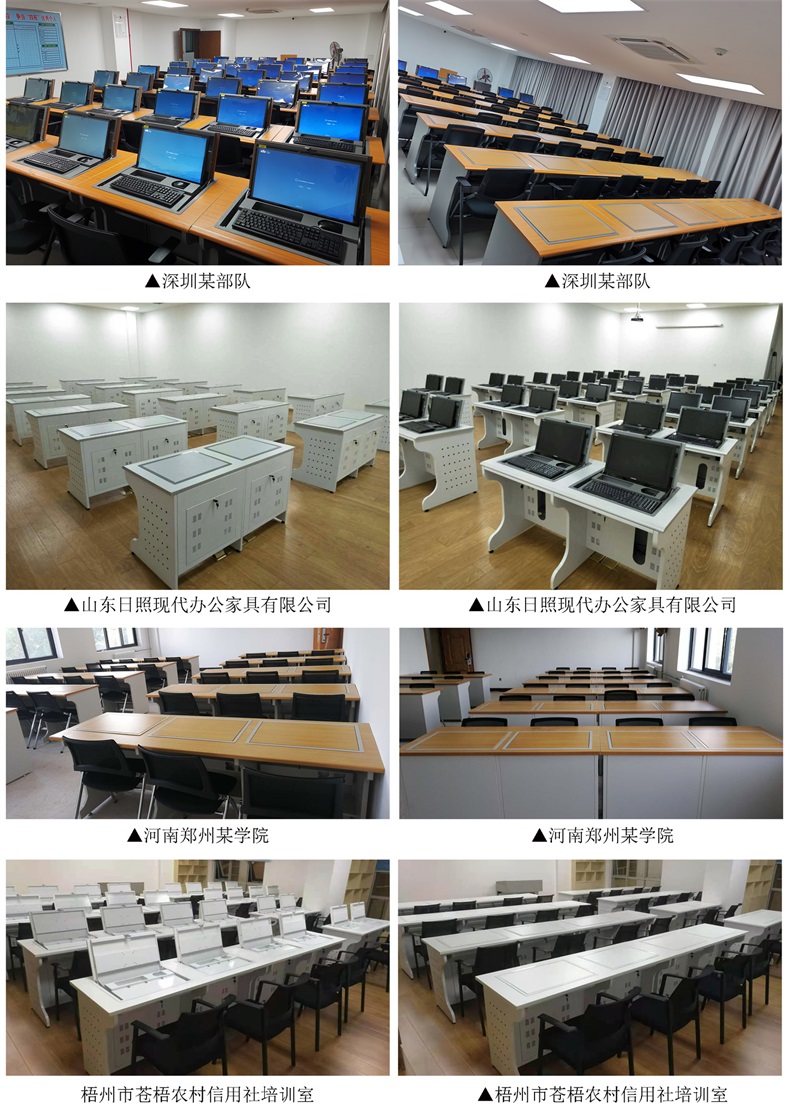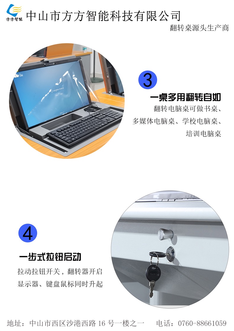 電腦翻轉桌,翻轉器與電腦桌配套使用,拉動開關按鈕液晶顯示屏會自動翻起,鍵盤也同時升起與桌面齊平。當不需要使用電腦時,可用手動按下翻蓋面板。整個翻轉器與桌面齊平,和普通的教室無異,產品具有防盜、防塵保持桌面平整,美化桌面等功能。電腦桌內還可以存放各類文具和學習用品,滿足一教室多用的需求。 資訊熱線:0760-88661059